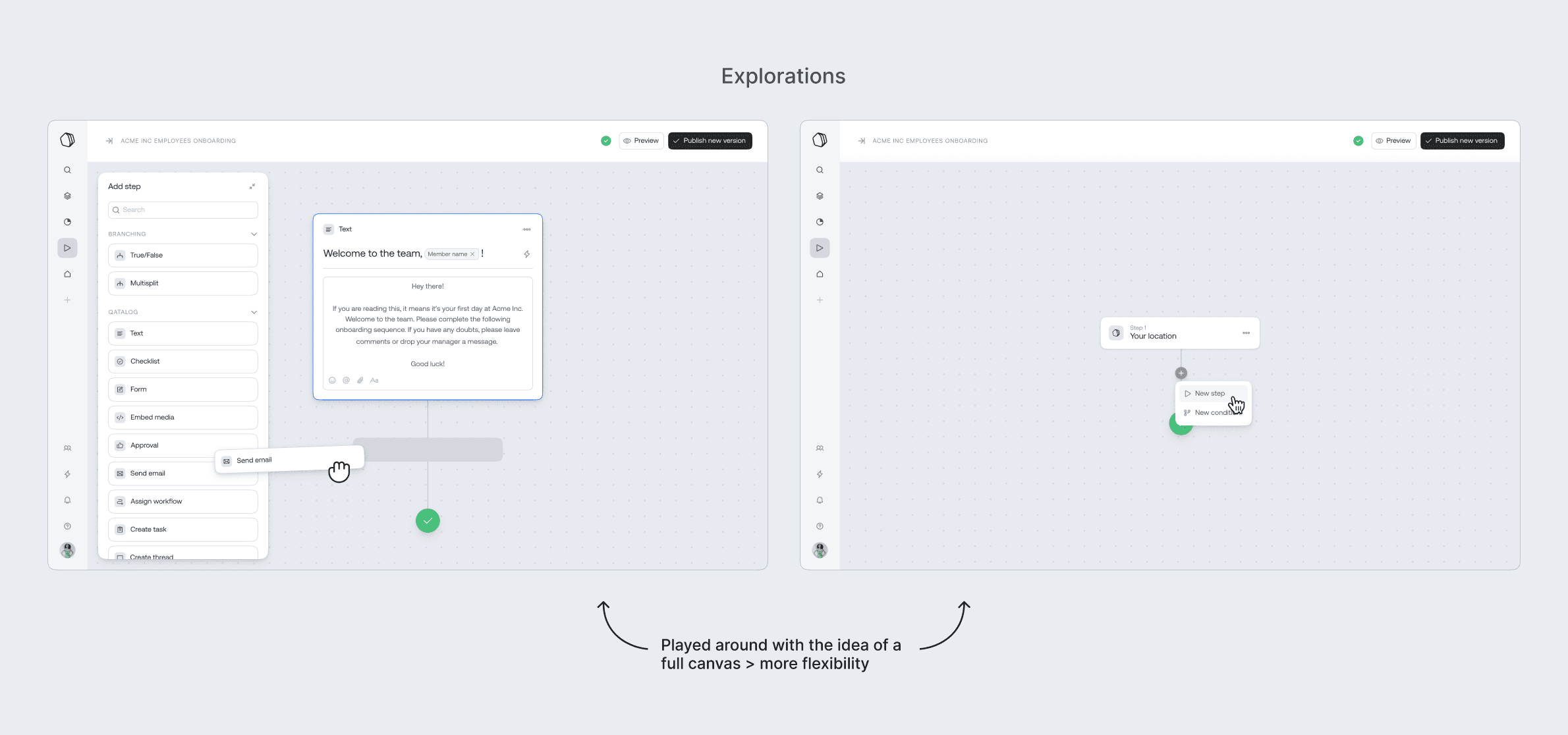 Through iteration and testing, we arrived at a canvas-based model that provided users with a clear bird’s-eye view of their workflows while keeping individual steps lightweight and easy to edit. To reduce confusion, I also designed distinct views for assignees and assignors, ensuring each role had a tailored experience. The differences were intentionally subtle at first, giving us room to test with real users and gather insights before committing to more significant divergence.