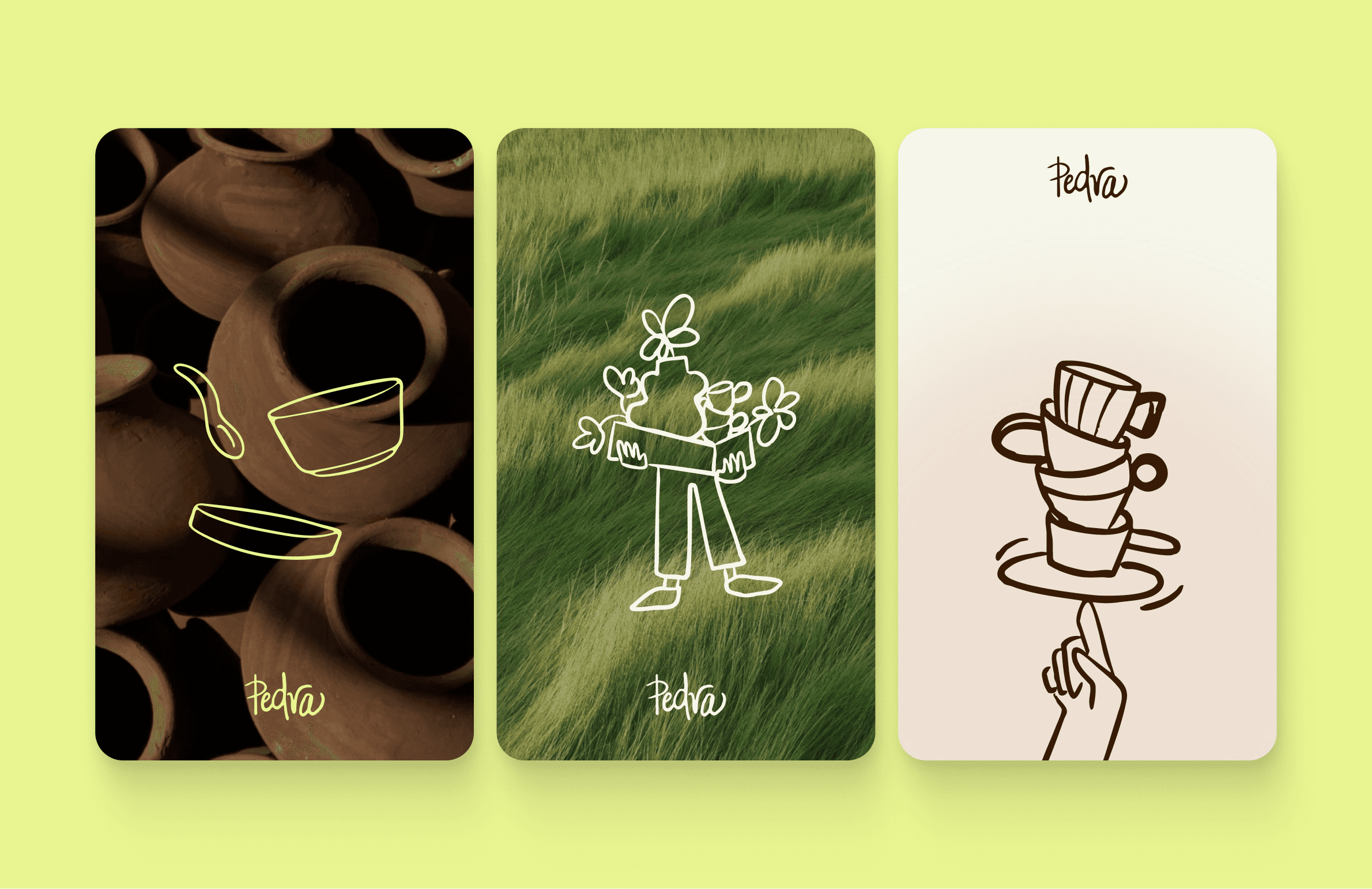 Visual identity design and illustration for Pedra, a fluid, modern and unique studio developing and producing japandi style ceramics.